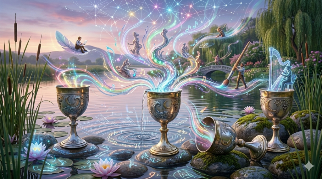 La créativité dans les Coupes est une forme de « naissance émotionnelle ». C’est l’expression de l’âme qui ne peut plus être contenue. Si vous bloquez sur un projet artistique, l’apparition des Coupes suggère souvent de lâcher prise sur la technique pour revenir au « ressenti ».