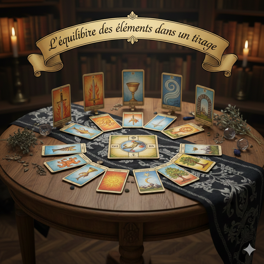 Au-delà de la signification individuelle des cartes, l’analyse globale d’un tirage repose sur l’équilibre des quatre éléments.